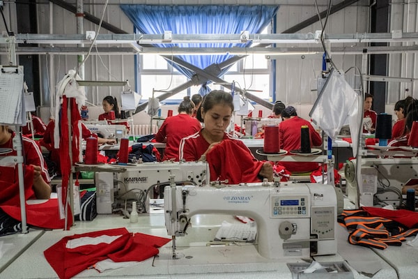 Uyghur workers at a garment factory in the Xinjiang region of China, on Aug. 3, 2019. Experts have estimated that roughly one in five cotton garments sold globally contains cotton or yarn from Xinjiang.GILLES SABRIE/The New York Times