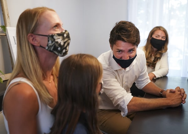 Liberal Leader Justin Trudeau, centre, talks with eighth-year-old Mila Greco, second left, and and her mom Trisha Greco, left, at their home before announcing mental health funding at campaign stop during the Canadian federal election in Kanata, Ont., on Aug. 31.Nathan Denette/The Canadian Press