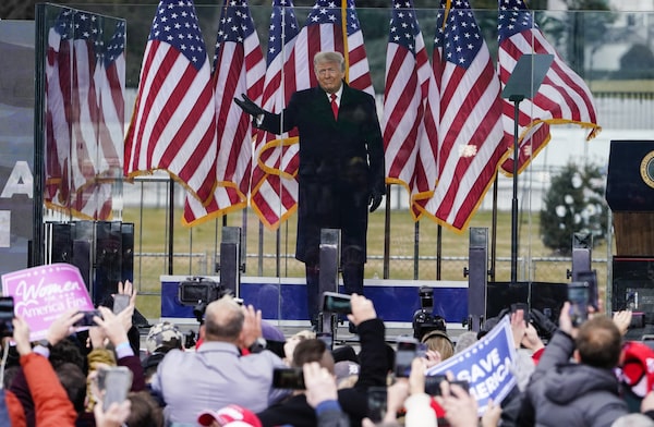 President Donald Trump arrives to speak during a rally protesting the electoral college certification of Joe Biden as President in Washington, Jan. 6, 2021. Members of the House committee investigating the events of Jan. 6 will hold their first prime time hearing Thursday, Jan. 9.Jacquelyn Martin/The Associated Press