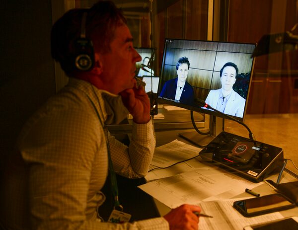 A translator works as WE Charity founders Marc Kielburger, screen left, and Craig Kielburger, screen right, appear as witnesses via videoconference during a House of Commons finance committee meeting in the Wellington Building in Ottawa on July 28, 2020.Sean Kilpatrick/The Canadian Press