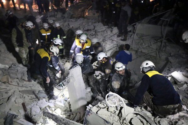 This Sunday, Jan. 7, 2018 photo provided by the Syrian Civil Defence White Helmets shows Civil Defence workers inspecting a damaged building after a bombing that targeted the office of a militant group consisting of foreign fighters in Idlib, Syria.Uncredited/The Associated Press