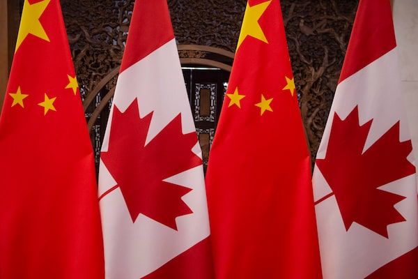 Canadian and Chinese flags photographed prior to a meeting with Justin Trudeau and China's President Xi Jinping at the Diaoyutai State Guesthouse in Beijing on Dec. 5, 2017.FRED DUFOUR/AFP/Getty Images