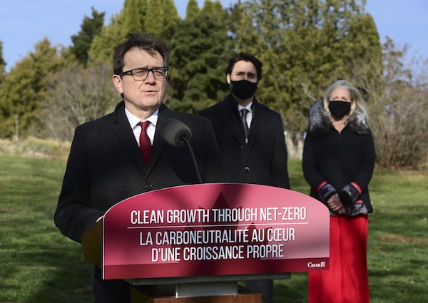 Minister of Environment and Climate Change Jonathan Wilkinson, left to right, Prime Minister Justin Trudeau and Minister of Infrastructure and Communities Catherine McKenna hold a press conference at the Ornamental Gardens in Ottawa on Nov. 19, 2020.Sean Kilpatrick/The Canadian Press
