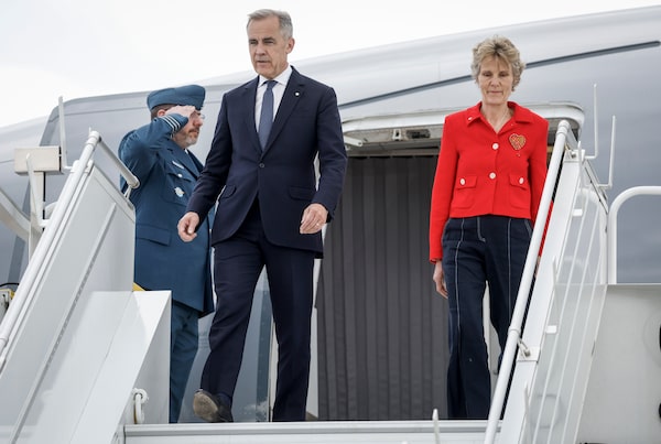 Prime Minister Mark Carney and his wife Diana Fox Carney arrive in Calgary for the G7 meeting on Sunday.Jeff McIntosh/The Canadian Press