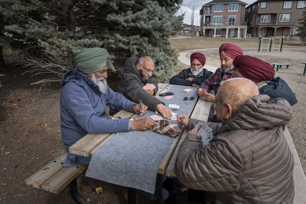 This group of men playing cards in Saddlestone in northeast Calgary are all originally from Punjab. South Asians make up a large share of the community in the city's northeast quadrant.