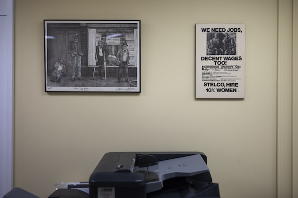 Posters at the United Steelworkers Adjustment Centre commemorate organized labour's history in the city, such as a 1980 campaign to hire more women at Stelco.