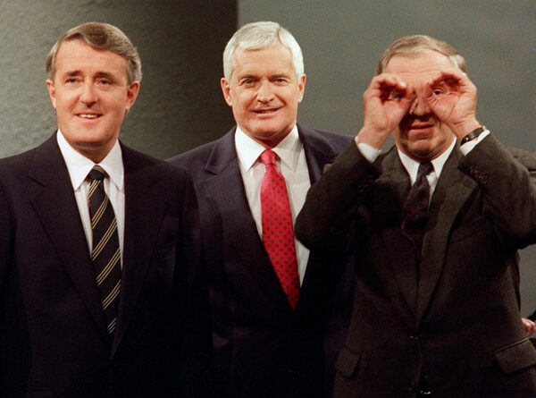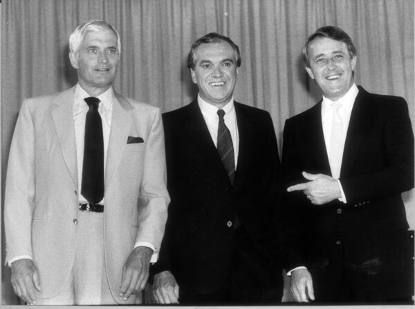 The three federal party leaders put their heads together as they chatted before the first of two televised debates. NDP Leader Ed Broadbent, left, Tory leader Brian Mulroney and Prime Minister John Turner on July 24, 1984.UPC