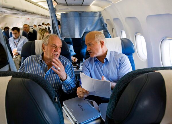 NDP leader Jack Layton, right, goes over his speaking notes with Ed Broadbent, while on the campaign plane in Toronto on Oct. 10, 2008.Nathan Denette/The Canadian Press