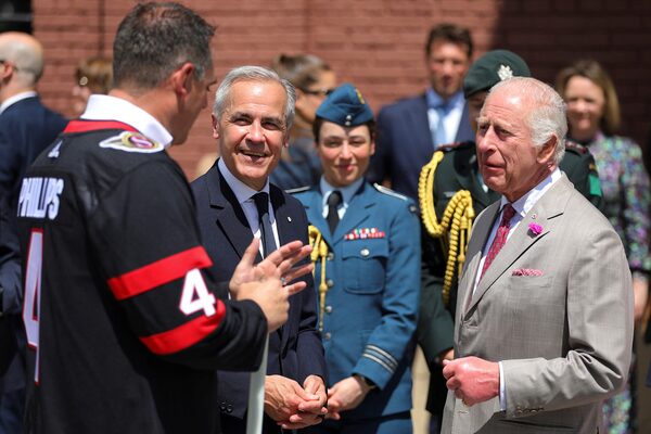 King Charles stands with ice hockey player Chris Phillips and Prime Minister Mark Carney, as he visits Lansdowne Park during a two-day visit in Ottawa, on May 26.Evan Buhler/Reuters