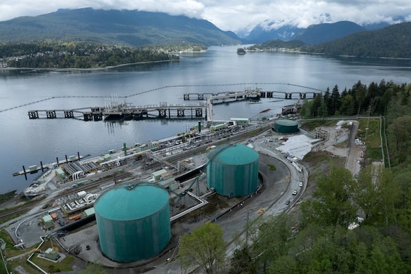 Three berths able to load vessels with oil are seen at Westridge Marine Terminal, the terminus of the Trans Mountain Pipeline expansion project in Burnaby, B.C. on April 26.Chris Helgren/Reuters