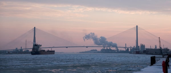 The under-construction Gordie Howe International Bridge linking Detroit to Windsor, Ont., on Tuesday.Rebecca Cook/Reuters