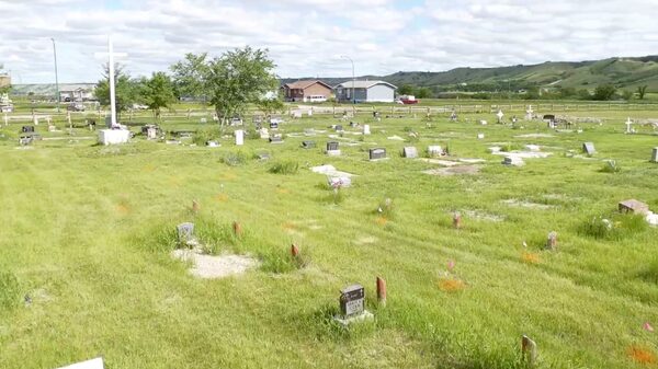 Drone footage of the gravesite restoration project taken on June 18/2021 at the site of the former Marieval Indian Residential School in Saskatchewan . Cowessess First Nation, in a press conference Thursday, said it discovered 751 unmarked graves at a cemetery.Cowessess First Nation