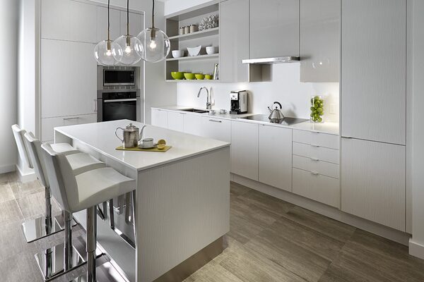 Harbour Plaza kitchens, boast custom-designed cabinetry, a custom island and engineered-quartz countertops. MENKES DEVELOPMENTS