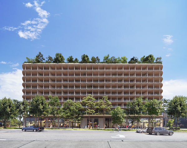 Consequently, the project can be built with mass timber, which is generally not an option for buildings that have set-backs. It will also use pre-fabricated elements made in local manufacturing facilities and shipped to the construction site, thus reducing construction waste and emissions related to concrete. As Mr. Bakstah says, “Mass timber isn’t the goal; it’s a tool.”