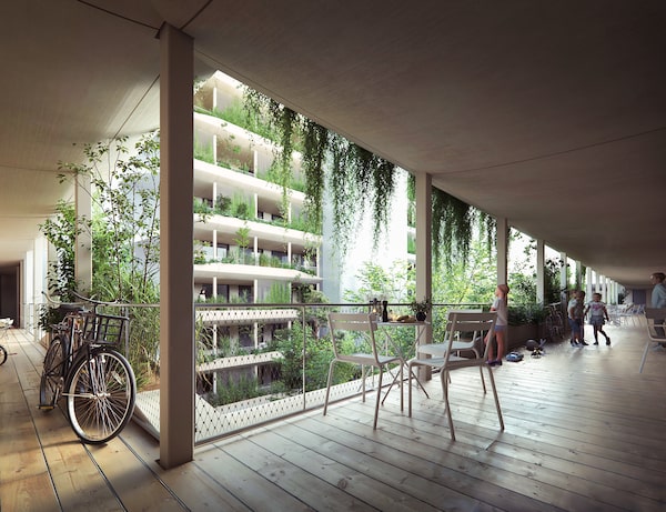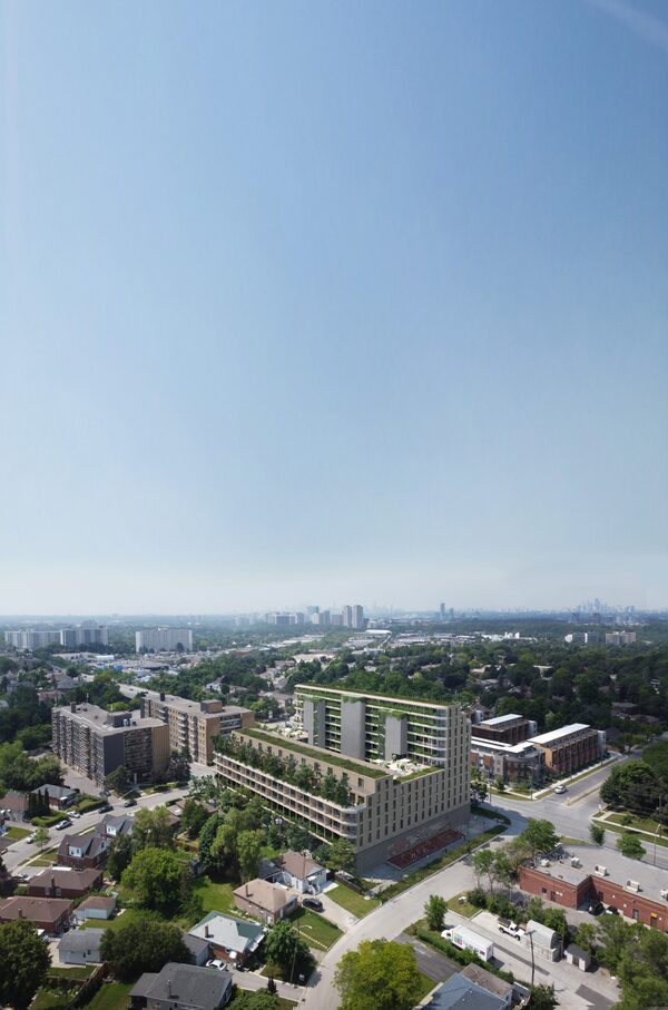 Their design involves the use of single-loaded exterior corridors overlooking the internal courtyard that will serve as the focal point for the 12-storey, 168-unit, mass-timber project, which, they say, will be the first privately developed “Tier 4″ (or net-zero) building under the Toronto Green Standard. (TGS sets out an escalating set of performance benchmarks for new buildings. Tier 4 is the most exacting, and all the Tier 4 projects built to date are public.)