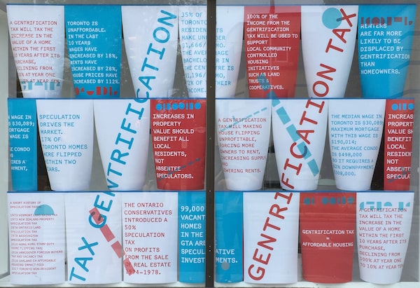 Earlier this year in a “blink and you might miss it” moment, a plywood billboard was erected in Toronto’s Trinity Bellwoods park inscribed with two bold proclamations: “Gentrification Tax” was the opening shot, and “The real estate market is destroying this city” was the chaser.