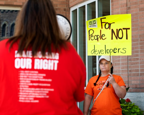 Dawn Barger, a member of ACORN, protests eviction notices by Pulis Investment Group during a rally outside Brampton City Hall on Sept 1.Fred Lum/The Globe and Mail