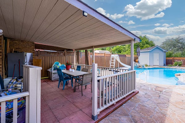 The main floor is arranged with a living room with a gas fireplace and a separate eat-in kitchen with newly updated stone countertops, cabinetry and stainless steel appliances. Sliding doors open to a covered patio and in-ground pool.
