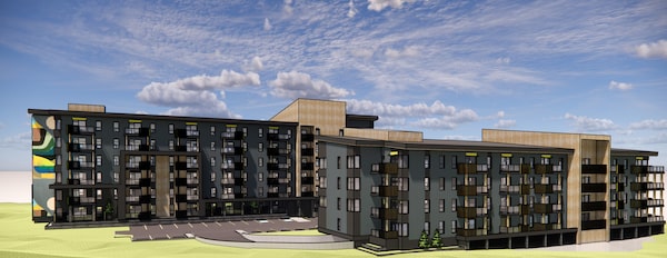 Renderings of the planned housing project at 100 Palliser Lane, a 144-unit non-market rental building that could break ground as early as August. Canmore is working on an ambitious plan to build 1,300 homes over the next two decades in Palliser Trail, a 23 hectare development on publicly owned land where at least 75 per cent of the units created are anticipated to be non-market.City of Canmore