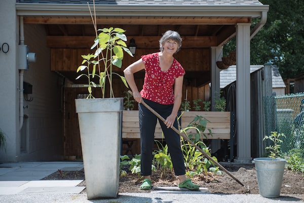Janet Joy Wilson rakes the soil in her driveway, which she is gradually depaving and converting into a garden, in Toronto on July 18, 2020.Galit Rodan/The Globe and Mail