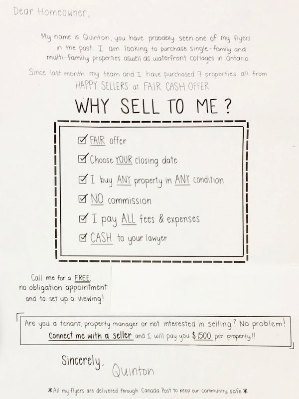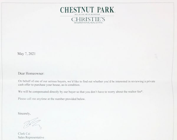 Clark Cai, a sales representative with Chestnut Park Real Estate Ltd. Brokerage in Toronto, delivers “Dear Homeowner” letters, clearly identifying himself on company letterhead. While most of his business is on MLS, he also represents clients who want to buy in specific pockets. He’s been finding an increase of people interested in selling off-market, mainly because they don’t want people going through their house during a pandemic.