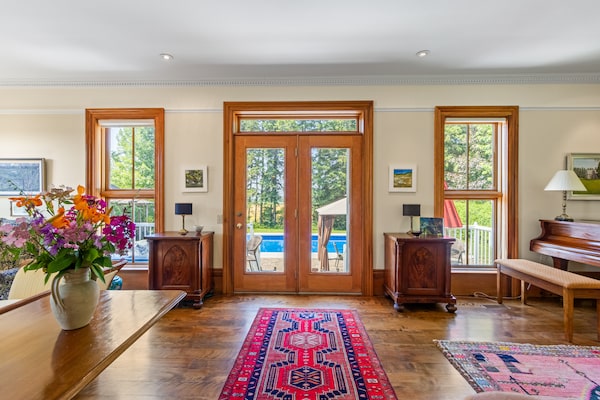 The new portion added a great room overlooking the swimming pool, a new kitchen, a dining room, a library and a reclaimed 1876 front door transported from another county.