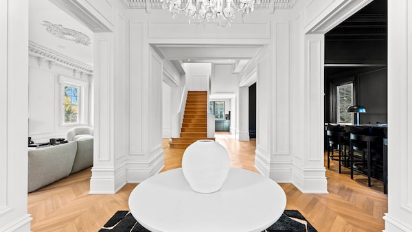 The foyer under no fewer than three tiers of wedding-cake style elaborate plaster moulding (all of which was meticulously preserved and restored when necessary) looks straight through to the back of the house, where new, larger-scale windows draw in light from the riverside. To the right is the black-walled bar area and dining room, to the left is the soft-ivory-walled living room. Pre-gut, all these rooms had either bold colours or wallpaper; now they are solidly either black or white from floor to ceiling.