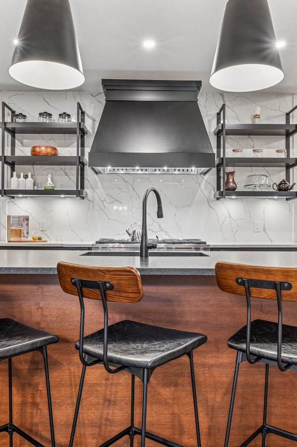 The open-plan kitchen has a large island and a breakfast area. There’s also a dining room with a sliding barn-style door on that level.