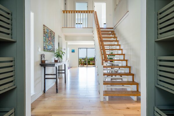 Accessed by either the front door or an interior door to the garage, the foyer takes a left turn into the main living space of the house. Continuing past a set of open stairs to the second level, the hallway looks straight through with a glass sliding door to the rear deck providing an outdoor view.