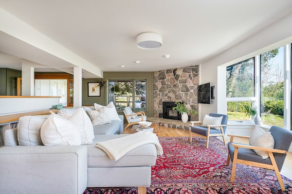 Skipping past the first entrance to the kitchen on the right, at the terminus of the hallway, the central living area opens up with the dining room on the right and the living room on the left. The kitchen is just behind, over a half-wall that opens that room up to the large windows and doors. In the corner is a granite mantle and wood-burning fireplace that is tied into the heating for the house.