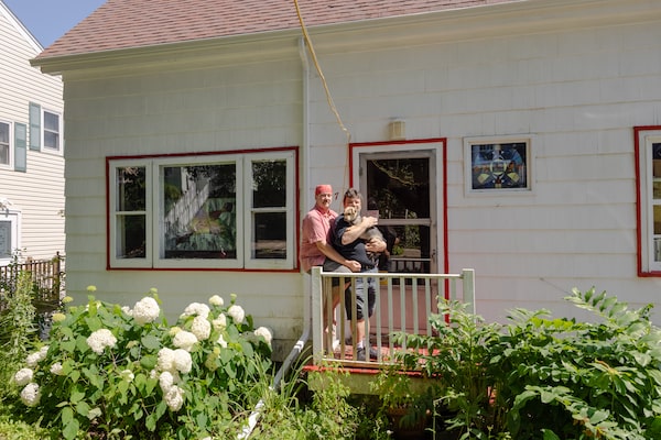 Dan Mackay, his partner Paul Pitre and dog Smokey in front of his home in Halifax on Aug. 1.The Globe and Mail