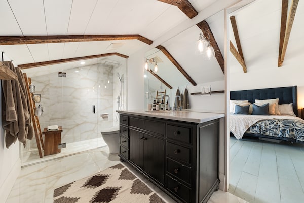 At the top of the stairs is an office/library made more cozy by the angled attic walls, but the primary suite takes advantage of the vaulting peak of the roofline (with some more exposed wood stringers) to provide a little more wow factor. Tucked under the eaves is a full ensuite bathroom with an infrared sauna.