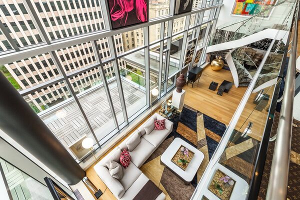 In a new wing of the historic Ritz-Carlton hotel, this 5,301-square-foot suite has a two-storey plan with double-height windows and multiple terraces, plus bedrooms and entertaining areas on both levels connected by an elevator. There’s also a circular glass and steel staircase.