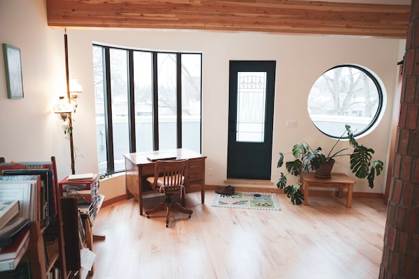 When Mr. Bykewich and his wife, Geneviève, a journalist, acquired a $405,000 property in Edmonton’s Old Strathcona neighbourhood, he saw a chance not only to build a forever home for his family (the couple has two young boys) but also to experiment with curvilinear shapes, the kind you don’t often see on the Prairies. As the principal of Ethos Engineering, a local consulting firm, Mr. Bykewich possessed the expertise necessary to pull such a project off. And while the house is by no means an exemplar of Art Nouveau design – it feels, with its heavy timber, rough finishes and rugged masonry, very much like a Prairie home – it nevertheless draws loosely on Nouveau principles. It is an assemblage of irregular, curvy forms in a city where such things are rare.