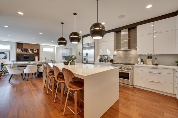 This two-storey house has a contemporary design with an enclosed den on the main floor, and open entertaining areas on two levels, including the basement.