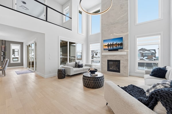 The two-storey house has an attached, triple garage and more than 3,230 square feet of living space, including a living room with a gas fireplace and double-height ceilings.