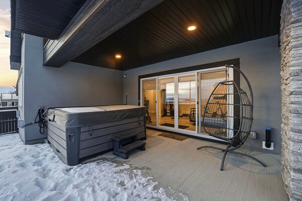 The basement has an additional bedroom and a recreation area with a wet bar and an exit to a patio and hot tub.