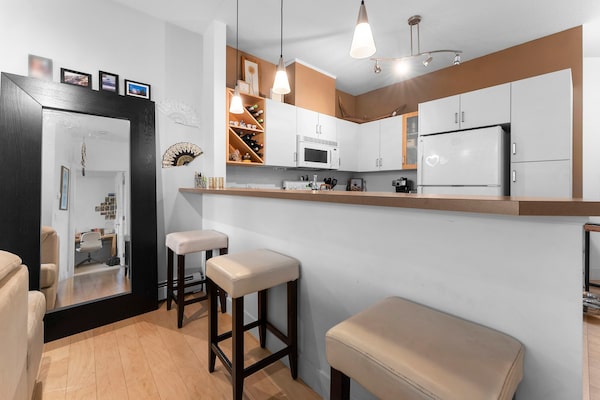 The 750-square-foot unit has a contemporary design with a U-shaped kitchen.eXp Realty