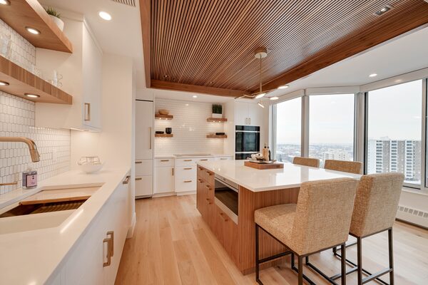 Highlights of its recent makeover include quartz countertops and walnut ceiling treatments in the kitchen, as well as a wet bar with a copper sink and matte black fixtures in the adjacent dining area.