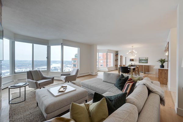 This roughly 40-year-old unit has a 2,216-square-foot plan with nine-foot ceilings and southwest-facing windows overlooking the Victoria Golf Course and North Saskatchewan River.