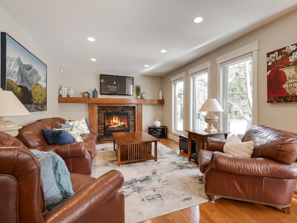 The basement has a fourth bedroom and a recreation area with a fireplace and a wet bar.