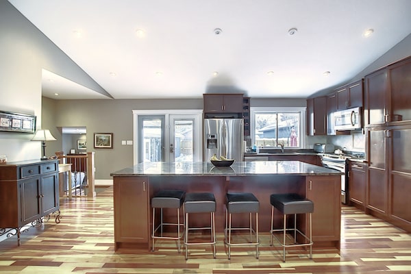 The kitchen and dining area is open-concept with vaulted ceilings, a granite-topped island and an exit to the private backyard.Re/Max House of Real Estate