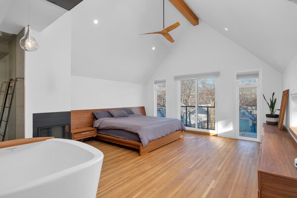 Upstairs, the primary bedroom has a vaulted ceiling, a double-sided, gas fireplace and a balcony, as well as a walk-in closet and an open-concept, five-piece bathroom with a freestanding tub.