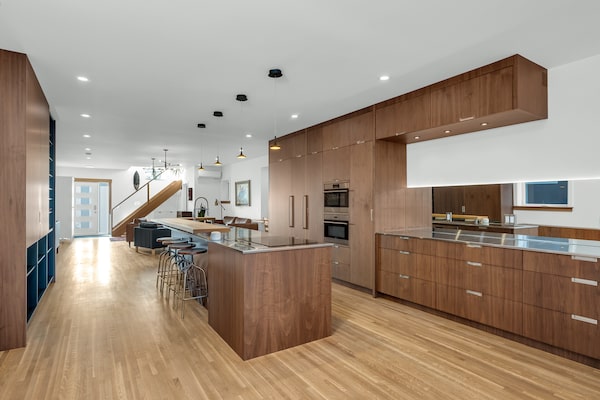This 112-year-old house marries Scandinavian and Japanese design elements throughout, from its gated front garden to a minimalistic kitchen inside with walnut cabinetry and stainless steel countertops.