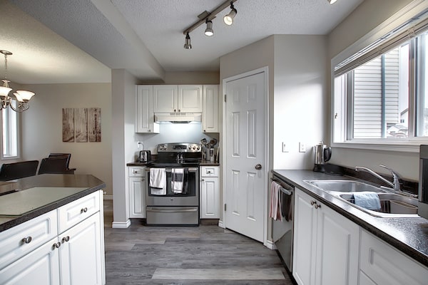 Recent updates include new laundry appliances and vinyl plank flooring in the living room, the central dining area and the rear kitchen. The kitchen also has a corner pantry, an island, stainless steel appliances and a walkout to a deck.