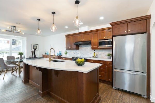 The eat-in kitchen was redone with a nine-foot-long island, quartz countertops and stainless steel appliances.