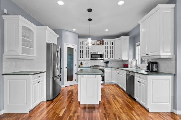 The eat-in kitchen is outfitted with stainless steel appliances, a pantry and island.eXp Realty