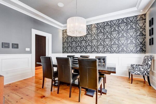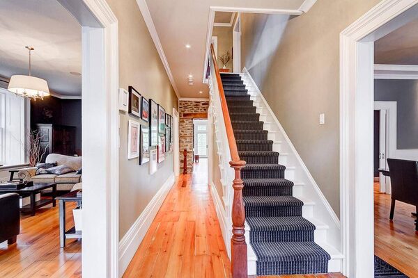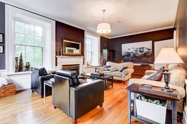The floors are reclaimed hemlock and the stone walls of the original exterior have been left exposed. A modern glass and stainless steel railing in the family room is juxtaposed against the grey stone. “I’m drawn to the natural elements – steel and glass and wood,” says Ms. Shaw. The dining room, living room and staircase in the old part of the house have been left mostly as they have always been. The windows still contain the original glass panes. “I still love this room,” says Ms. Shaw of the living room. “There’s something about the light quality in here.”