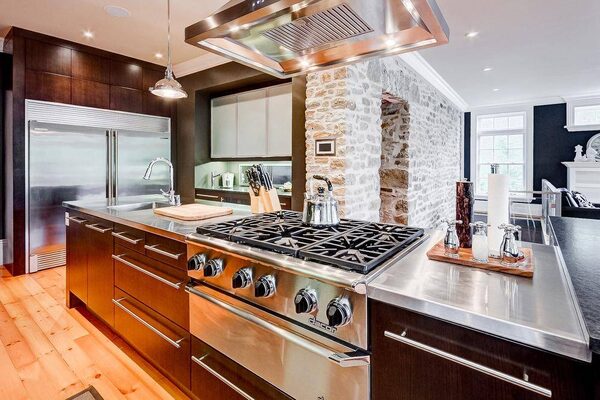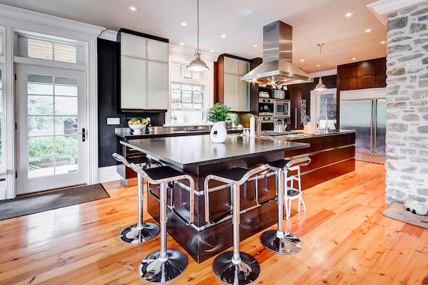 Despite the age of the house, Ms. Shaw envisioned a modern addition and renovation. “I like that tension between the modern and the old and I think they can both work together,” says Ms. Shaw.The original summer kitchen at the side of the house had been turned into a TV room. Ms. Shaw transformed it into a very large mud room with a heated limestone floor, lots of cupboards and a large island with drawers for mittens and baseball gloves and all manner of paraphernalia.