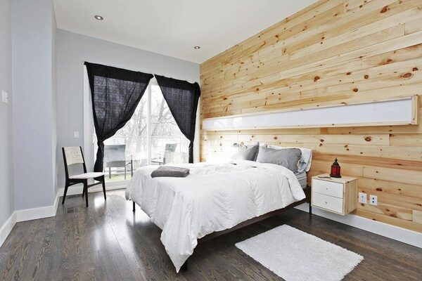 The master suite is Mr. Elrayyes’ favourite part of the home. It’s not an outlandishly big room. A king-sized bed feels appropriate, not lost. Flanking the bed are floating bedside tables and a boxy light fixture that runs the lengths of the headboard and can change to a number of colours, including lavender, baby blue and orange. These are attached to an accent wall made out of exposed pine, warming up the otherwise clean space.